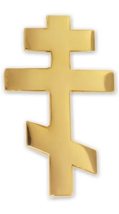 Still another interpretation of the slanting footboard is that it symbolizes the part played by those two thieves who were crucified with Christ. The thief on the right repented and is represented by the raised side of the lower crossbar, while the lowered left side represents the other thief who blasphemed Christ during His crucifixion and was condemned. The extra cross bar at the top of the Slavonic cross represents the inscription board nailed above Christ on the cross. The inscription, "This is Jesus, the King of the Jews", was written in three languages, Greek, Latin and Hebrew. One explanation sometimes given in Eastern Church literature is that the Slavonic cross is the replica of the cross planted by the Apostle Andrew when he looked northward over the mountains of the Caucasus and predicted that a great Church would arise. St. Andrew thus became the prophet of the Slav-Byzantine Church. The modern St. Andrew's cross, however, is in the form of an "X", the shape of the cross upon which this disciple was crucified. The Slavonic cross, with its added inscription bar at the top, and one slanting footboard bar below, more fully symbolizes the crucifixion that the commoner simple cross, which has only one upright bar and only one crossbar. NOTE: This cross is used extensively both by Catholics of the Byzantine Rite and the Eastern Orthodox of Slavic descent who share the same heritage of Eastern Christianity.